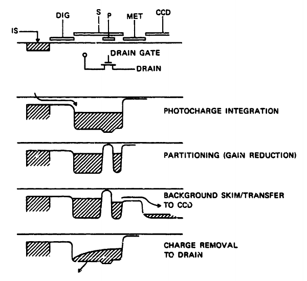 Электроны, генерируемые в результате поглощения фотонов аккумулируются плоскими матрицами p-n-переходов. Возникающий в результате фототок с каждого отдельного элемента детекторной решётки переводится на ПЗС-матрицу через отдельные индиевые соединители. Вводные ячейки ПЗС осуществляют функцию подавления фона, таким образом снижая интенсивность фонового потока и расширяя динамический диапазон ПЗС[4]. В ПЗС-матрицах конструкции Rockwell International был применён способ подавления фона, реализующий одновременно два технологических принципа: скольжение (скимминг) и разделение заряда[5]. В период с 1978 по 1980 г. инженерами Rockwell International уделялось особое внимание разработке чётко определяемой и воспроизводимой последовательности обработки инфракрасного сигнала в ходе прохождения его через пассивированный полупроводниковый материал приёмников, а также повышению их производительности[6].