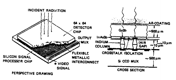 - Гальванизированных индиевых столбиков, соединяющих электромеханическим способом детекторную решётку с силицидным мультиплексором.