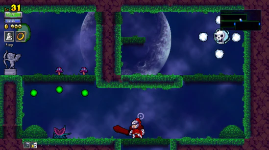 После гибели персонажа игрок может использовать собранное им золото для улучшения характеристик будущих персонажей, а также потратить на покупку нового оружия, брони и рун, каждая из которых придаёт персонажу определённую способность[2]. Чтобы получить доступ к определённой руне, игроку необходимо разблокировать её — для этого нужно найти в игре комнату с магическим сундуком и выполнить определённое задание, например, дойти до сундука без единого прыжка или уничтожить всех врагов в комнате. Если условие выполнено успешно, персонаж сможет открыть магический сундук и активировать найденную руну, позволяющую персонажу, например, совершать двойной прыжок[3][4]. Помимо рун, по ходу игры можно обнаружить сундуки с чертежами, открыв которые, игрок получает доступ к мечу или броне, которые впоследствии игрок сможет надеть на своего персонажа. Оружие и броня повышают атаку, защиту и ману игрока, а некоторые элементы брони и мечи могут дать игроку те или иные способности, такие как повышение шанса критического удара или восстановление очков здоровья после убийства врага[6].