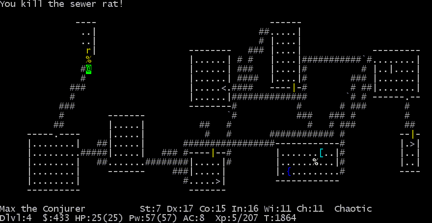 Игра Nethack с классическим ASCII-интерфейсом с видом сверху