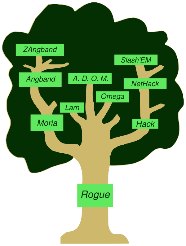 Жанр назван по имени прародителя — игры Rogue, разработанной для системы UNIX в 1980 году,[3] хотя вышедшие ранее игры Beneath Apple Manor и Sword of Fargoal также относят к жанру roguelike. В 1980-х и 1990-х годах roguelike приобрели огромную популярность среди программистов и студентов американских университетов, что привело к появлению большого количества подражаний и ответвлений, сохраняющих, однако, характерные особенности игр-предшественниц. К числу наиболее известных roguelike принадлежат Hack, NetHack, Ancient Domains of Mystery, Moria, Angband и Tales of Maj’Eyal, а также японская серия коммерческих игр Mystery Dungeon.