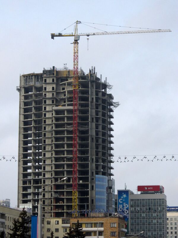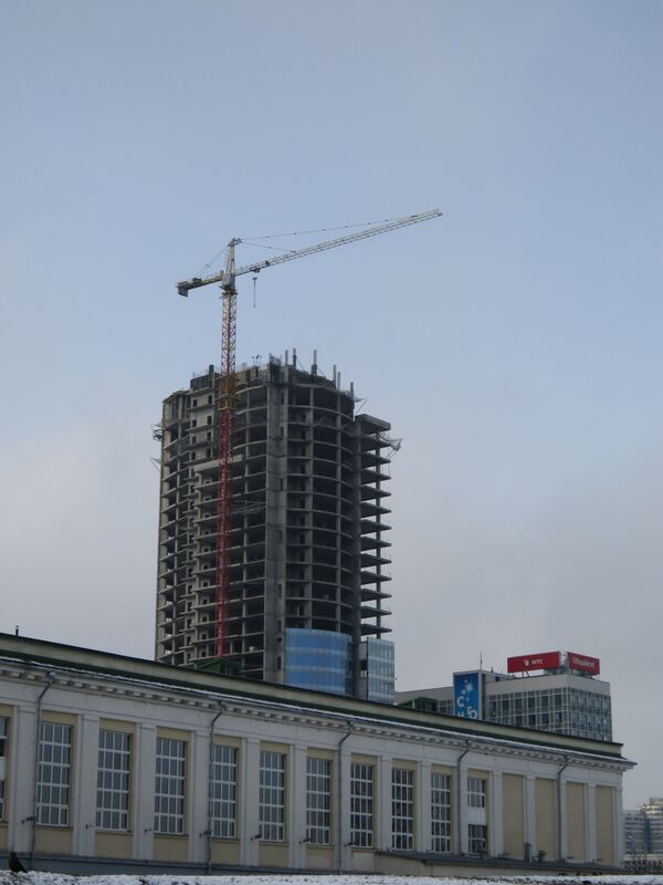 В октябре — ноябре 2011 года стройка была приостановлена, так как была проблема с поставкой остекления из Литвы. В январе 2012 года оставалось залить два этажа и смонтировать шпиль. Планировалось сдать объект в конце 2012 года[2]. Позже от литовской компании было заявлено, что поставка стекла осуществляется по графику[3].