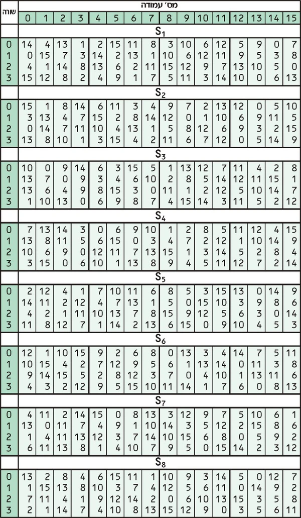 | Значения 1‑го и 6‑го бит на входе | 00 | 0010 | 1100 | 0100 | 0001 | 0111 | 1010 | 1011 | 0110 | 1000 | 0101 | 0011 | 1111 | 1101 | 0000 | 1110 | 1001 |