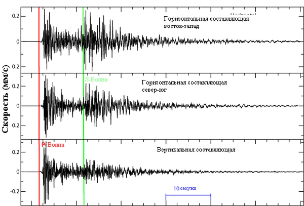 Типичные значения для скоростей S-волн во время землетрясений находятся в диапазоне от 2,5 до 5 км/с. Скорость поперечной волны всегда меньше скорости продольной волны, что видно на сейсмограммах (рисунок 3). В отличие от Р-волны, S-волна не может проходить через расплавленное внешнее ядро Земли, и это приводит к существованию теневой зоны для S-волн. Но они ещё могут появиться в твёрдом внутреннем ядре, так как возникают при преломлении Р-волны на границе расплавленного и твёрдого ядра, что называется разрывом Леманн, возникающие S-волны затем распространяются в твёрдой среде. И затем S-волны преломляются по границе, и они снова в свою очередь создают P-волны. Это свойство позволяет сейсмологам определять свойства внутреннего ядра.