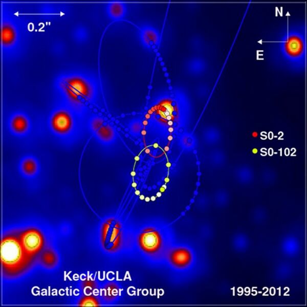 В октябре 2012 года группа астрономов под руководством доктора Андреа Гез, работавших в обсерватории Кека, после 17-летних наблюдений сообщила об открытии нового объекта. В кластере звёзд, обращающихся вокруг сверхмассивной чёрной дыры Стрелец A*, расположенной в центре Галактики, была обнаружена звезда, получившая наименование S0-102. Она (на время открытия) обладала самым коротким периодом обращения вокруг чёрной дыры — 11,5 лет. До неё рекордные характеристики были зарегистрированы у её соседа — звезды S2. Именно S2 мешала обнаружить её ещё раньше, так как обладает светимостью в 16 раз выше, чем S0-102.