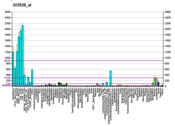 Белок экспрессирован с высоким уровнем в скелетных мышцах, лимфоцитах периферической крови, селезёнке и вилочковой железе. Детектируется на яичках, мозге, почках, тонком кишечнике, предстательной железе, сердце, плаценте, лёгких и поджелудочной железе, отсутствует в толстом кишечнике и печени.