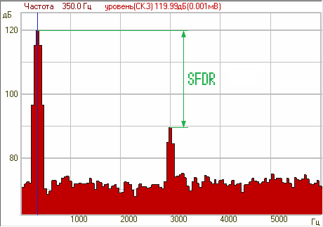 SFDR вычисляется как отношение СКЗ гармоники на несущей частоте (максимум в спектре сигнала) на входе АЦП или выходе ЦАП к СКЗ следующей по величине гармоники, которая может быть при искажении сигнала, или к максимальному значению шума (в спектре) если искажений нет. Обычно выражается в децибелах. В зависимости от условий измерения, SFDR может измеряется как в заданной частотной полосе, так во всей доступной полосе частот (от нулевой частоты до частоты Найквиста) преобразователя.