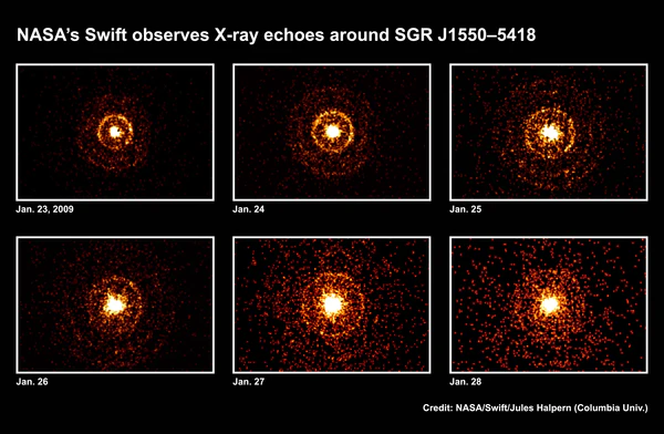 Долгое время считавшийся типичным источником гамма-излучения, SGR J1550-5418 привлёк внимание астрономов проявлением активности 23 октября 2008 года. Интенсивность гамма-всплесков нарастала, особенно сильная активность была зарегистрирована 22 января 2009 года. Объект стал предметом исследования орбитального телескопа Swift[2]. Так, выяснилось, что гамма-репитер производит по нескольку вспышек в минуту, самые мощные из которых несут энергию, эквивалентную энергии Солнца, вырабатываемой за 20 лет. По своим характеристикам SGR J1550-5418 представляет собой нейтронную звезду, а точнее её разновидность — магнетар.