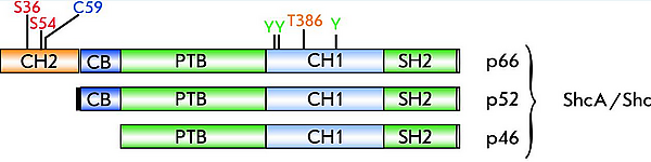 Ген ShcA, кодирующий белок SHC1, расположен на 1 хромосоме и кодирует 3 изоформы: p66SHC, p52SHC и p46SHC. Они отличаются длиной, функциями и клеточной локализацией [2]. Но все они имеют сходную доменную организацию, включающую N-концевой фосфотирозин-связывающий (PTB) домен и С-концевой SH2 (Src homology 2) домен. Изоформа p66shc имеет дополнительный CH2 домен на C-конце [1]. Изоформы p53Shc и p66Shc имеют также CB (cytochrome binding) домен.