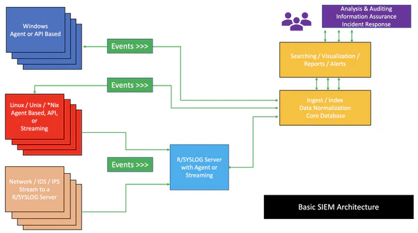 Архитектура SIEM может варьироваться в зависимости от поставщика, однако общие компоненты типичны для большинства решений:[26]