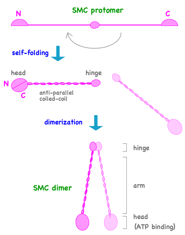 SMC димер образует V-образную структуру с двумя длинными двуспиральными плечами[14][15]. На концах молекулы белка, N-терминальный и C-терминальный фрагменты вместе образуют АТФ-связывающий домен. Другой конец молекулы называется «шарнирным участком». Два отдельных SMC-белка димеризуются своими шарнирными участками, в результате чего и образуется V-образный димер[16][17]. Длина каждого двуспирального плеча ~ 50 нм. Такие длинные «антипараллельные» двуспиральные структуры являются уникальными, и найдены только в SMC-белках (а также и их гомологов как Rad50). АТФ-связывающий домен SMC-белков структурно подобен аналогичному домену ABC-транспортёров, большой семьи трансмембранных белков, специализирующихся на перемещении низкомолекулярных соединений через мембраны.