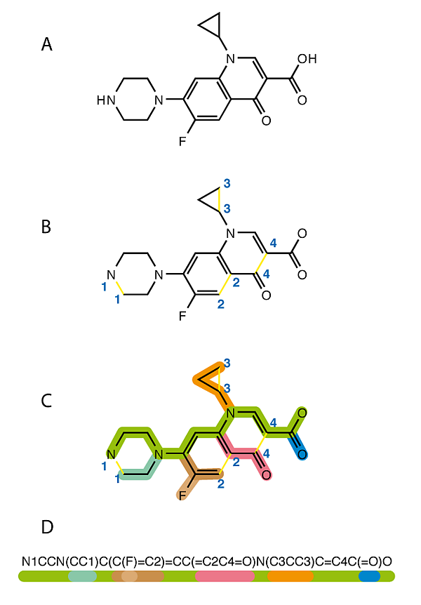 Например, запись SMILES для воды будет выглядеть как O, для этанола — CCO. Гидроксильный анион записывается [OH-], а ион железа (II) как [Fe+2].