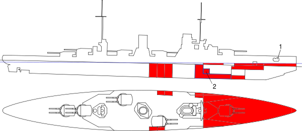 Подводная защита обеспечивалась вертикальной противоторпедной переборкой, отстоящей от борта на 4 м на миделе. Переборка имела толщину 30 мм, увеличиваясь до 50 мм в районе погребов боезапаса, и заканчивалась 20-мм поперечными переборками. Между бронированной и верхней палубами она продолжалась как противоосколочная и имела толщину 30 мм[13][11][7][8]. Дополнительную конструктивную защиту обеспечивали угольные бункеры, расположенные между бортом и противоторпедной переборкой.