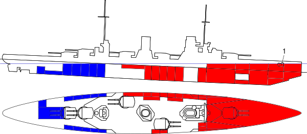 пояс: 300 мм палуба: 30—50 мм башни ГК: 250 мм барбеты ГК: 230 мм каземат ПМК: 150 мм командирская рубка: 300 мм |
