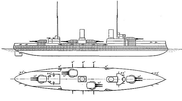 Бронирование жизненно важных частей корпуса выполнялось из крупповской цементированной брони. Общий вес бронирования достигал 33,3 % от нормального водоизмещения. Главный броневой пояс шёл от переднего края носовой башни до заднего края кормовой. Пояс имел постоянную толщину 250 мм на высоте 1,22 м, углубляясь под воду на 0,35 м. Дальше он постепенно утончался до 150 мм в 1,6 м ниже ватерлинии. Пояс располагался на подкладке тикового дерева толщиной 50 мм. В оконечностях он заканчивался 180-мм траверзами. В нос он продолжался 120-мм поясом, утончавшимся до 100 мм. В корме он шёл толщиной 120 мм и заканчивался в 3,5 метрах от кормы 100-мм переборкой. Дальше в корму шёл 100-мм пояс с нижней кромкой в 80 мм[13][14].