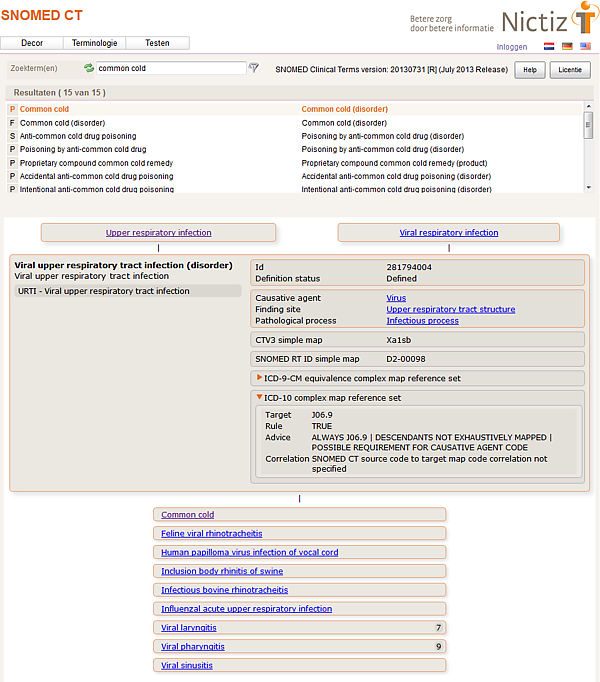 Свойства SNOMED CT как тезауруса выражаются в существовании отношения типа «концепт-термин». Приведём пример: для концепта «82272006» существует несколько синонимичных терминов — «насморк», «острый вирусный ринофарингит» и «вирусная инфекция верхних дыхательных путей», а также термины на других языках — «viral upper respiratory tract infection», «acute coryza» (англ.).