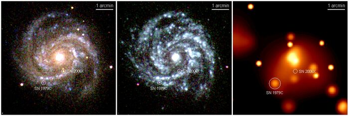 Снимки местоположения сверхновых SN 2006X и SN 1979C в ультрафиолетовом и рентгеновском диапазонах. Фотографии телескопа Спитцер.