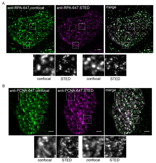 Для его преодоления в STED-микроскопии используется второй лазер с бо́льшей длиной волны для стимулирования излучательных переходов в веществе по краям фокусного пятна. При облучении кольцевым лазером происходит принудительное испускание перехода с возбуждённого уровня на некоторый вибрационный уровень. Таким образом, на краях пятна происходит обеднение населённости возбуждённого уровня, и люминесценция на длине волны подавляется, позволяя достичь лучшего разрешения в центральной области.