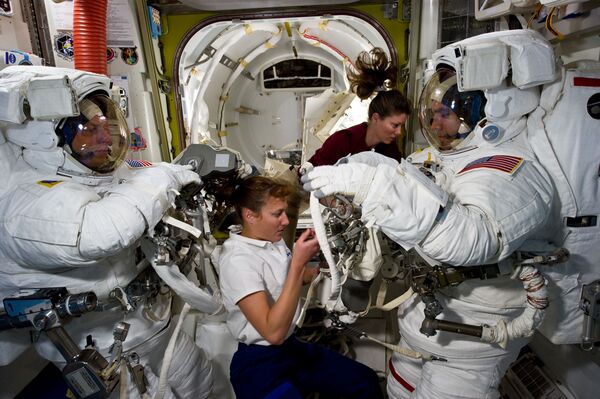 Ричард Мастраккио и Клей Андерсон готовили свои скафандры, оборудование и инструменты к предстоящему на следующий день третьему выходу в открытый космос.