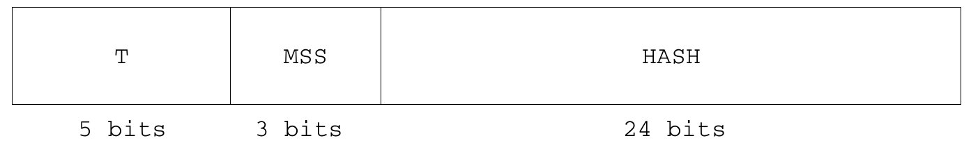 где — ISN клиентского SYN-пакета, — счётчик времени в 5 бит, — закодированное значение MSS (от 0 до 7), и — секретные ключи сервера, — криптографическая хеш-функция (например, MD5 или SHA-1), , , и — соответственно исходный адрес, порт источника, адрес назначения и порт назначения[10].