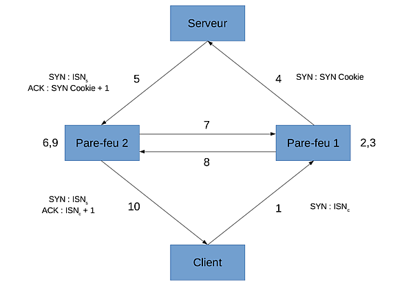 - клиент посылает SYN, который попадает на межсетевой экран 1;