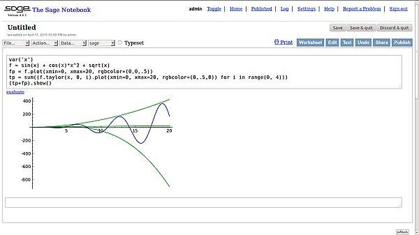 Функции и данные можно выводить в виде плоских и трёхмерных графиков. Есть набор инструментов для добавления собственного пользовательского интерфейса к вычислениям и приложениям[3]. Имеются средства подготовки научно-технической документации с использованием редактора формул и возможностью встраивания Sage в документацию формата LaTeX[4].