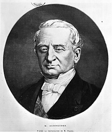 В 1830 году Адольф Шнейдер, представитель банка Сейер, участвовал в разграблении богатств Регентства Алжир (в начале колонизации Алжира)[13][14]. В 1836 году в Ле-Крезо (Сона и Луара) была основана коммандитная компания Schneider frères et Cie (с 1845 года — Schneider et Cie) с Адольфом и Эженом Шнейдером в качестве управляющих. Компания специализировалась на производстве стали, железнодорожных рельсов и паровозов, судостроении и вооружении (пушки, броня)[15].