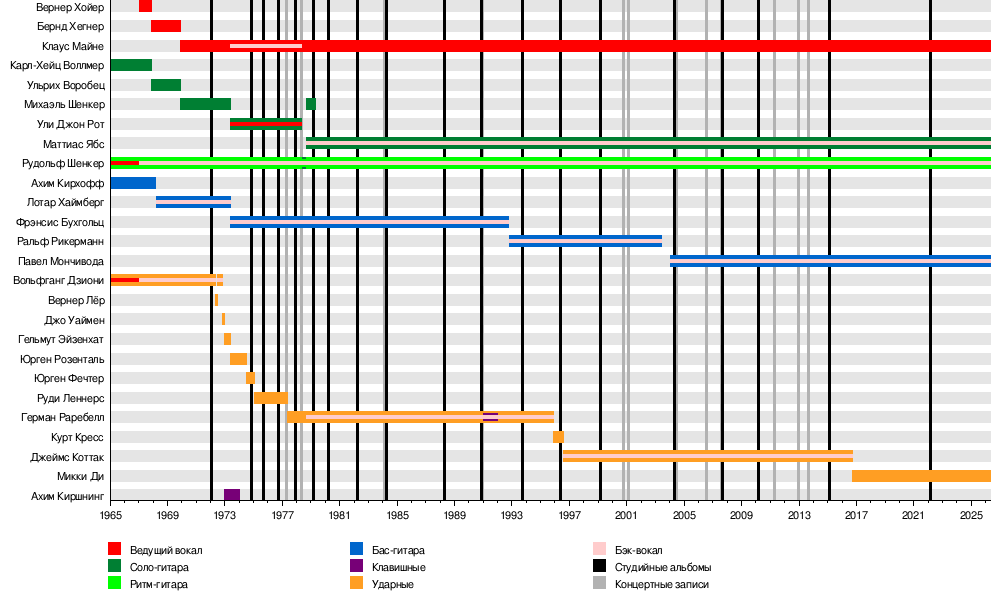 - Клаус Майне — ведущий вокал (1969—наши дни), бэк-вокал (1973—1978)