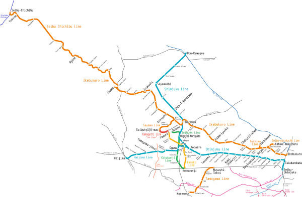 - Линия Икэбукуро (池袋線): Икэбукуро—Токородзава—Ханно—Агано (57,8 км)