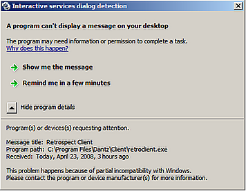 Однако такая схема приводит к проблемам обратной совместимости, поскольку часть программного обеспечения была рассчитана на работу службы в одной сессии с вошедшим пользователем. Для поддержки такого сценария в Windows Vista и Windows Server 2008 была введена служба Windows «Interactive Services Detection», позволяющая пользователю открывать диалоги, созданные интерактивными службами. Пользователю показывалось окно с предложением переключиться в сеанс 0 для взаимодействия с диалогом[9]. В Windows 10 Creators Update эта возможность была удалена[10].