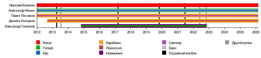 - Николай Комягин — вокал (2012—2026)[50]
