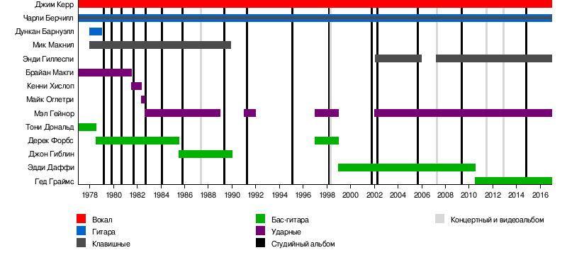 Ядро Simple Minds состоит из двух оставшихся первоначальных участников, Джима Керра (вокал) и Чарли Бёрчилла (электрические и акустические гитары, иногда клавишные после 1990 года, саксофон и скрипка). Другими нынешними участниками группы являются Гед Граймс (бас-гитара), Шерисс Осей (ударные), Сара Браун (бэк-вокал), Горди Гауди (дополнительная гитара и клавишные) и Беренис Скотт (клавишные). Среди известных бывших участников — Мик МакНил (клавишные), Дерек Форбс (бас-гитара), Брайан МакГи и Мел Гэйнор (ударные)[10].