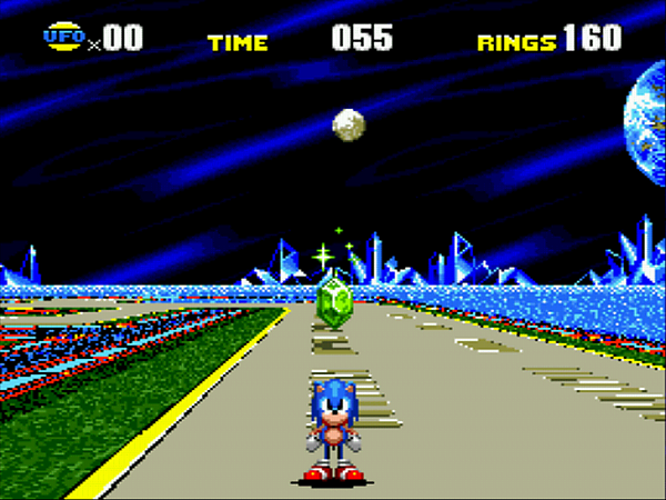 Этап представляет собой трёхмерную плоскую площадку, окружённую водой; его внешний вид зависит от раунда, через который игрок попал на «Special Stage»[21]. Задача игрока — уничтожить шесть НЛО, летающих по всему уровню[13]. После уничтожения некоторых НЛО, игроку даётся бонус в виде колец или увеличения скорости на некоторое время. Каждый этап имеет ограничение во времени, причём, если игрок коснётся воды, то время будет отниматься гораздо быстрее[26]. Каждый раз, когда на таймере останется 20 секунд, на середине этапа появится специальный НЛО голубого цвета, после уничтожения которого на таймер добавятся 30 секунд. В дополнение на этапе присутствуют разнообразные предметы, которые могут помочь или усложнить прохождение уровня[25].