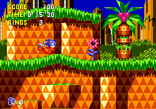 Игроку предстоит пройти семь игровых уровней, называемых зонами («Palmtree Panic», «Collision Chaos», «Tidal Tempest», «Quartz Quadrant», «Wacky Workbench», «Stardust Speedway» и «Metallic Madness»), каждый из которых разделён на три акта и заполнен различными врагами-роботами, называемыми бадниками (англ. Badnik)[13][14]. Главный герой атакует врагов на своём пути либо с помощью сворачивания в клубок во время прыжка, либо приёмом spin dash, разгоняясь на месте. После уничтожения бадников освобождается семечко и, попадая на землю, из него вырастает цветок[15]. Во время прохождения персонаж собирает золотые кольца, служащие защитой от бадников, а при сборе 100 штук дающие дополнительную жизнь[16]. Если игроку будет нанесён урон, то он потеряет все кольца, без которых персонаж гибнет при повторном получении урона. Выпавшие после получения урона кольца можно собрать, но только в течение ограниченного времени и не более 20 штук. На уровнях также разбросаны игровые бонусы, хранящиеся в специальных мониторах — например, временная неуязвимость или дополнительная жизнь[17]. После прохождения двух актов игрок сражается в третьем акте с боссом в лице доктора Роботника, однако в «Stardust Speedway» противником главного героя становится ещё и Метал Соник[18].