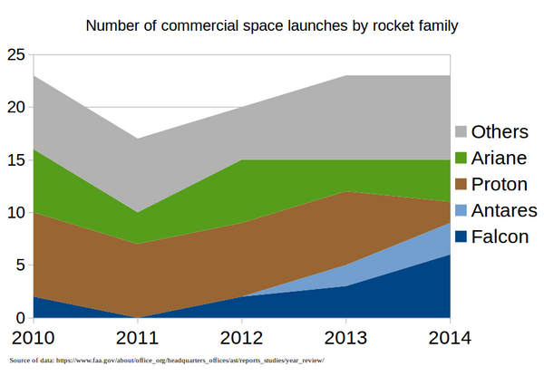 Руководитель европейской компании Arianespace (производит ракеты Ариан) заявил, что из-за давления SpaceX реструктуризируется вся европейская космическая индустрия[158]. Для сохранения своей позиции на рынке компания была вынуждена снизить цены[159] и запросить субсидии у государства[160]. К концу 2014 года SpaceX начала вытеснять компанию с лидирующей позиции на рынке коммерческих запусков[161].
