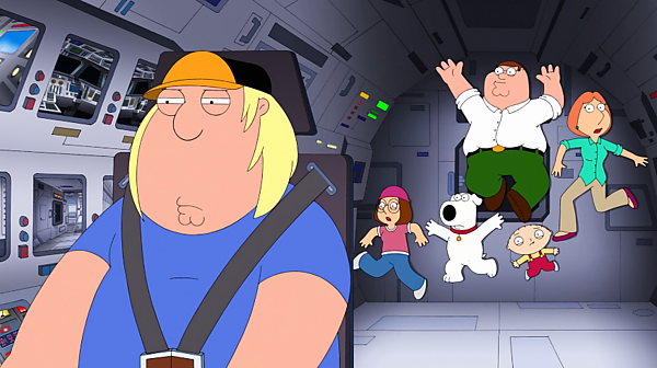 Приехав на Мыс Канаверал, Гриффины оставляют Криса в лагере. Брайан, Стьюи, Лоис и Питер желают Крису удачи. Однако, жизнь в лагере оказывается не так и хороша — над Крисом все подшучивают, а учёба ему никак не даётся. Он звонит домой и просит Лоис забрать его. Выхода нет — приходится приезжать за Крисом обратно. Однако, Питер уговаривает всех побыть в шаттле перед поездкой. Внутри корабля Стьюи нажимает кнопку запуска. Ракета взлетает в космос.