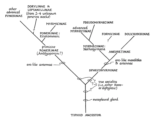 В настоящее время филогенетический анализ признаёт Sphecomyrma как сестринскую группу современных муравьёв, что означает, что это их стем-группа[28].