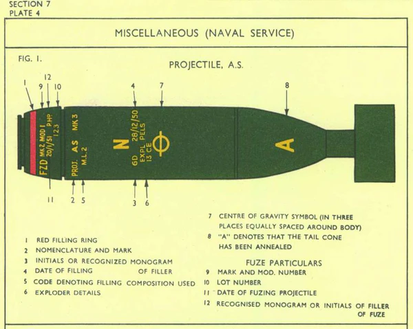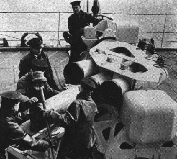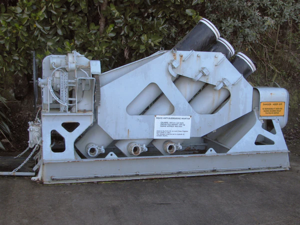 Установка имела три ствола калибра 12-дюймов (305 мм) под небольшим углом друг к другу, чтобы обеспечить нужный разлёт снарядов и покрытие ими определённой площади. Стволы были установлены в раме, которая могла поворачиваться на 90 градусов для перезарядки. Снаряды весили 200 кг, из которых 94 кг — взрывчатое вещество.[Note 1] На некоторых кораблях бомбомёты устанавливали на корме — бомбы выстреливались по ходу судна и падали в море немного впереди корабля.[1] Скорость погружения бомбы составляла 13,3 м/с, глубина подрыва задавалась часовым механизмом; во всех трех стволах снаряды устанавливались на одну глубину; глубину можно было постоянно менять вплоть до момента запуска в зависимости от движения цели. Максимальная глубина погружения составляла 270 м.