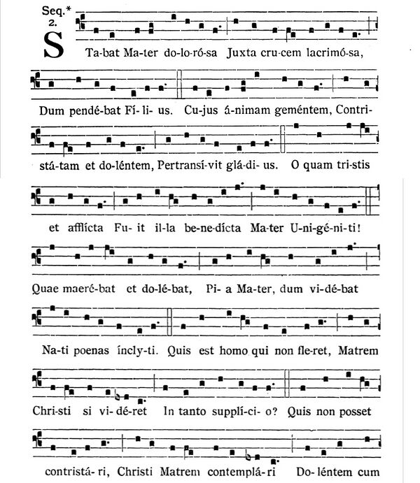 Своё название секвенция получила по инципиту «Stabat mater dolorosa» («Стояла мать скорбящая»). Первая часть текста повествует о страданиях Девы Марии во время распятия Иисуса Христа; вторая — молитва грешника к Богородице, заканчивающаяся просьбой о даровании ему спасительного рая.