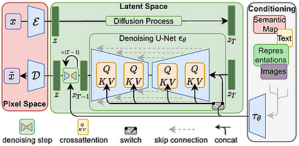 Денойзинг может проводиться с учётом текста, изображения или другой модальности, которые подаются на вход через механизм кросс-внимания[12] Для текстовых запросов применяется предобученный текстовый энкодер CLIP ViT-L/14.[5]. Исследователи отмечают большую вычислительную эффективность LDM по сравнению с «пиксельными» диффузионными моделями.