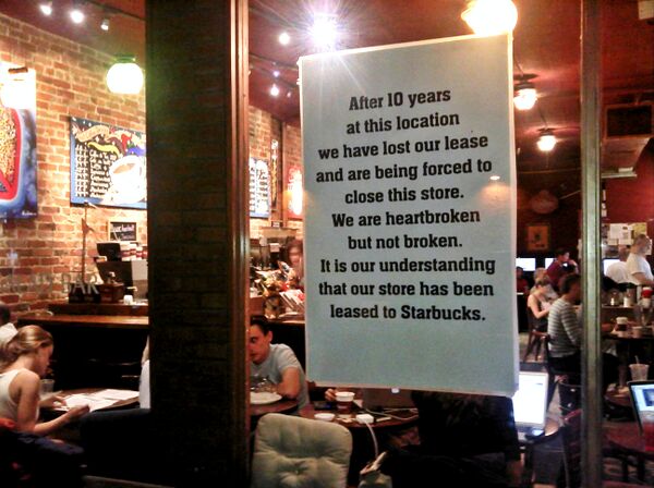 Starbucks использует некоторые методы, чтобы расширить и удержать свою позицию на рынке. Эти методы, называемые критиками антиконкурентными, включают откуп договоров об аренде, заключённых с конкурентами, намеренной работе в убыток и размещении нескольких точек в географически небольшой области (то есть насыщение рынка)[69]. Для примера, Starbucks вышла на британский рынок, выкупив Seattle Coffee Company, но затем использовала свой капитал и влияние для приобретения точек в престижных местах, некоторые из них работали в убыток. Критики заявляли, что это была нечестная попытка выбить с рынка небольших независимых конкурентов, которые не в состоянии платить завышенные цены за недвижимость премиум-класса[70].