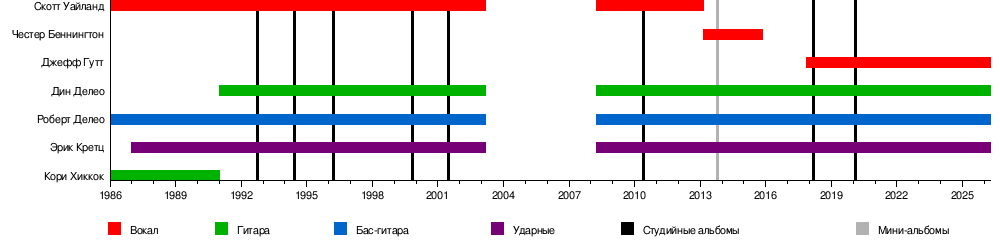 Stone Temple Pilots — американская рок-группа, существующая с 1986 года по настоящее время с перерывом с 2003 по 2008. На тот момент в состав группы входили Скотт Уайланд — вокал, братья Роберт — бас-гитара, вокал и Дин Делео — гитара, Эрик Кретц — ударные, перкуссия. Скотт Уайланд получил посмертное признание как «голос поколения» наряду с вокалистами Nirvana Куртом Кобейном и Alice In Chains Лейном Стэйли[3]. Считается одним из самых знаковых исполнителей 1990-х и вошел в сотню величайших вокалистов по версии Hit Parader[4].