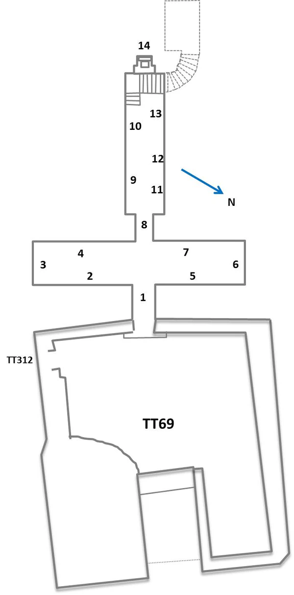Вырубленная в скале часовня TT69 имеет Т-образную планировку, включающую переднюю комнату, заднюю комнату и центральную нишу для святыни. Передняя и задняя комнаты ориентированы перпендикулярно друг другу, образуя перевёрнутую букву Т. Переднюю комнату TT69 часто называют широким или поперечным залом. Это отличает его от задней комнаты, называемой длинным залом из-за её ориентации[7].