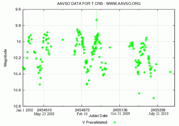 T Северной Короны, (T Coronae Borealis, T CrB) — звезда в созвездии Северной Короны. Она имеет неофициально название англ. Blaze Star (Полыхающая звезда)[5] и является одной из немногих известных повторных новых. Как правило, её светимость имеет величину около 10m, что находится вблизи границы разрешения типичных биноклей. Однако за время наблюдения было зарегистрировано две вспышки: первый раз 12 мая 1866 года, когда она достигла светимости 2,0m и во второй раз 9 февраля 1946 года когда её яркость достигла величины 3,0m[6]. Правда более новая статья (от 2009 года) показывает, что вспышка 1866 года имела возможное пиковое значение светимости в диапазоне 2,5 ± 0,5.[7]. Но даже когда на пике своей светимости она достигала величины 2,5m, то эта повторная новая уступала по яркости только лишь 163 звёздам в ночном небе[8], а если её светимость достигала величины 2,0m, то тогда она была 109-ой звёздой по яркости[9]. Сама T CrB является спектрально-двойной звездой состоящей из красного гиганта и белого карлика, который обращается вокруг главной звезды с периодом 227,6 дней[4].