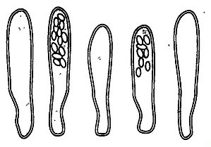 Аски размерами 25—75×5—11 мкм, булавовидные, с закруглённой верхушкой. Базальные клетки отсутствуют.