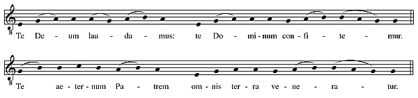 Колебание в ладовой атрибуции гимна в (стандартных) солемских книгах отражает ладовую неопределённость в самой его звуковысотной структуре[23]. В многочисленных изданиях Liber usualis и в Римском антифонарии (Antiphonale Romanum, 1912) гимн отнесён к третьему тону, в Монастырском антифонарии (Antiphonale monasticum, 1934) надписан как «третий и четвёртый тоны», в Гимнарии (1983) ладовая атрибуция у «Te Deum» вовсе отсутствует (номер тона не выставлен).