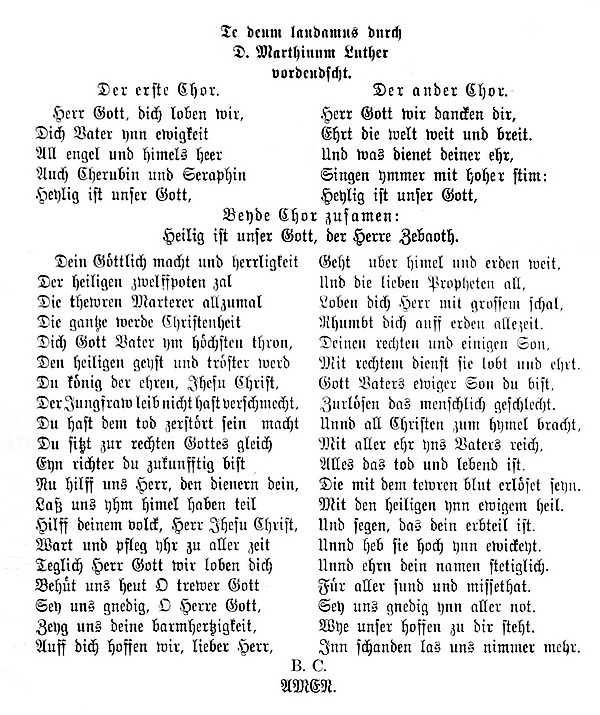 Гимн «Te Deum» также присутствует в богослужениях некоторых протестантских церквей (главным образом, англикан и лютеран). Мартин Лютер, в 1529 сочинивший собственный рифмованный перевод текста («Herr Gott, dich loben wir», см. иллюстрацию), ставил гимн чрезвычайно высоко, называл его «третьим Символом веры». Возможно, по этой причине ещё долгое время после Реформации в лютеранских церквах «Te Deum» распевали не только на лютеровский, но и на оригинальный латинский текст[25]. С XIX века широкое распространение получила немецкая обработка «Großer Gott, wir loben dich», сделанная в 1771 году католическим священником Игнацем Францем. Русский перевод этого текста появился в начале XX века в сборнике гимнов евангельских христиан «Гусли» (№ 165. Боже, славим мы Тебя).[26] В Англиканской церкви Te Deum (в переводе Книги общих молитв — «We praise thee, O God») является одной из двух неизменных песен утрени.