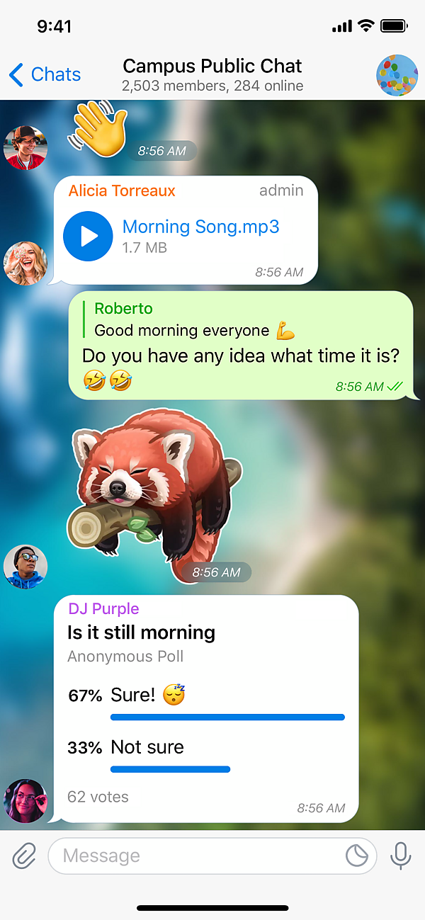 Чтобы сделать удобнее обсуждения в больших группах, общий чат в Telegram можно разделить на отдельные темы, это уменьшает разницу между интерфейсом мессенджера и разделённым на темы форумом[100]. В конце декабря 2022 года администраторы групп с более чем 100 пользователей получили право скрыть список участников[101]. В мае 2019 года появилась возможность привязать к каналу группу для обсуждения опубликованных постов[102][103]. Разработчики порадовали пользователей, сделав им на Новый год с 2021 на 2022 год подарок в виде официальной возможности ставить реакции в чатах и каналах[104]. С концептуальной точки зрения каналы дают читателям, с одной стороны, возможность ощутить себя на одном уровне с автором (публикации каналов выглядят так же, как и обмен личными сообщениями), а с другой — позволяют пользователям потреблять контент в удобной системе координат в формате отдельного диалога (отталкиваясь от хронологии публикации материалов)[105].