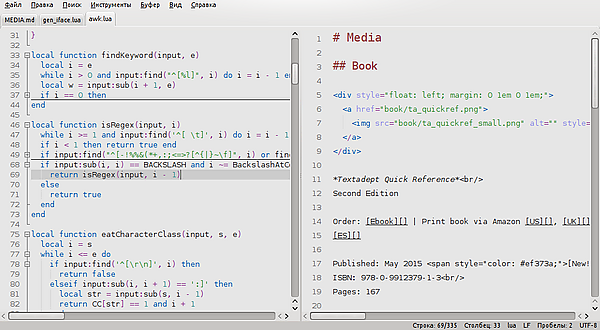 - Mitchell. Textadept Quick Reference. — Second Edition. — May 2015. — 167 с. — ISBN 978-0-9912379-1-3.