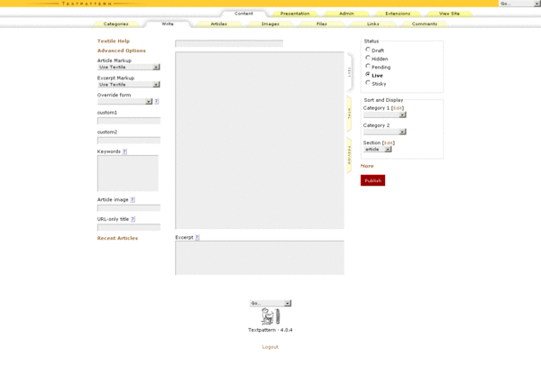 Основной контент сайта под управлением текстпаттерна сохраняется в виде статей (дополнительными видами контента являются ссылки, изображения и файлы). Каждая статья принадлежит к той или иной секции, а также одной или двум категориям (существуют плагины, позволяющие увеличить число связываемых со статьёй категорий), пользователи могут писать комментарии к статьям (если это разрешено в настройках сайта и секции).